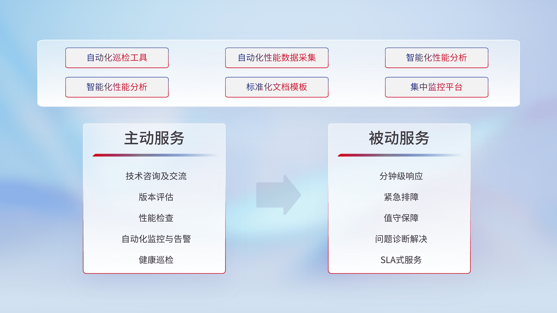 智能化工具和标准化文档,,,保障服务质量,,,提供主动服务(包含技术咨询、、、、版本评估、、性能检查、、、自动化监控与告警、、、、健康巡检)和被动服务包含(分钟级响应、、、紧急排障、、、值守保障、、、问题诊断解决、、、、SLA服务)。。
